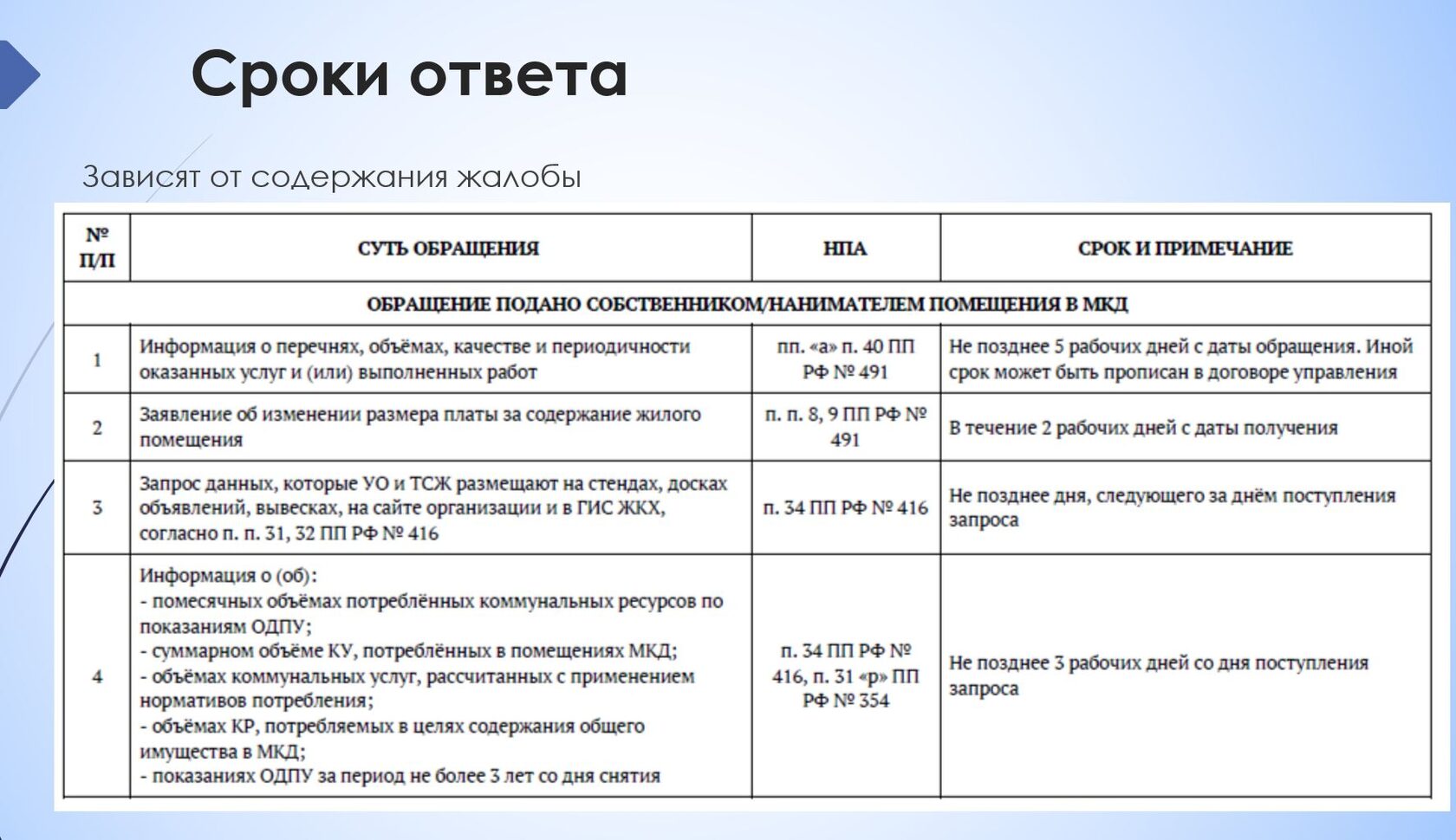2. Порядок рассмотрения обращений собственников. Сроки ответа, типовые жалобы.